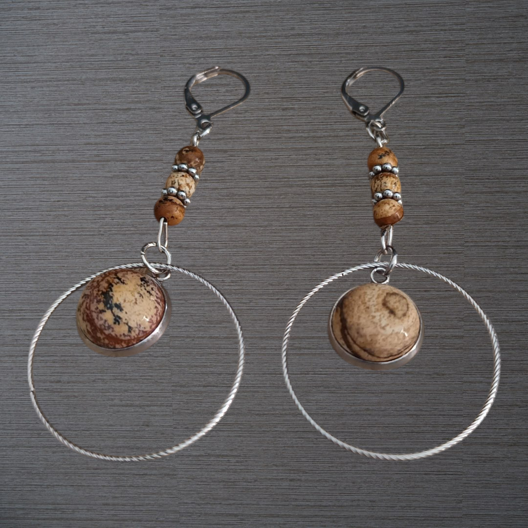 Matériaux : dormeuses et support acier inoxydable, cabochon Jaspe paysage en 12mm et perles en 4mm
